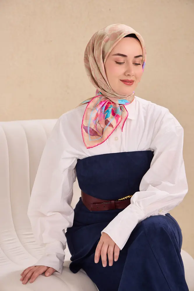 Pudra pembe, fuşya, gök mavi tonlarının doğal uyumunu yansıtan bu twill ipek eşarp, tok duruşlu yapısıyla gün boyu formunu korumak isteyen kullanıcılar için ideal bir seçimdir. Twill dokumasının sunduğu kaymaz kumaş özelliği, eşarbın başta kolay şekil almasını sağlar ve gün içinde kayma hissini en aza indirir.