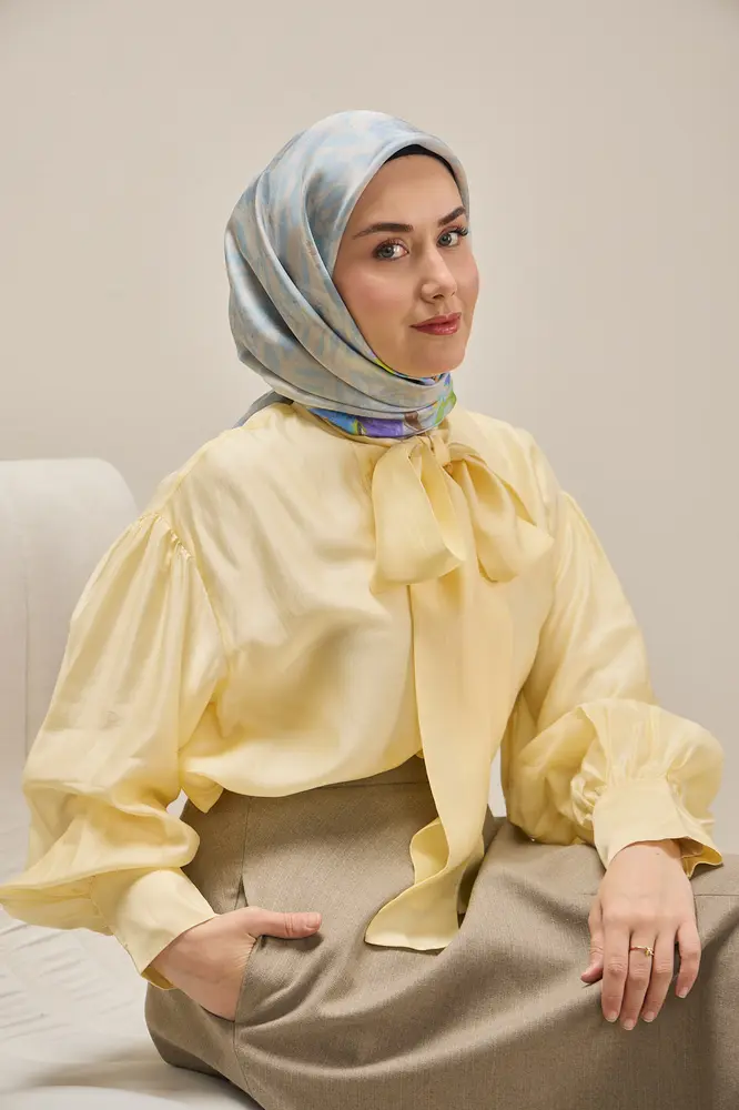 Gümüş, bebe mavi, mor, sarı tonlarının doğal uyumunu yansıtan bu twill ipek eşarp, tok duruşlu yapısıyla gün boyu formunu korumak isteyen kullanıcılar için ideal bir seçimdir. Twill dokumasının sunduğu kaymaz kumaş özelliği, eşarbın başta kolay şekil almasını sağlar ve gün içinde kayma hissini en aza indirir.