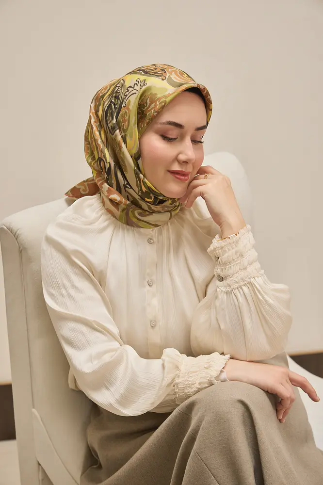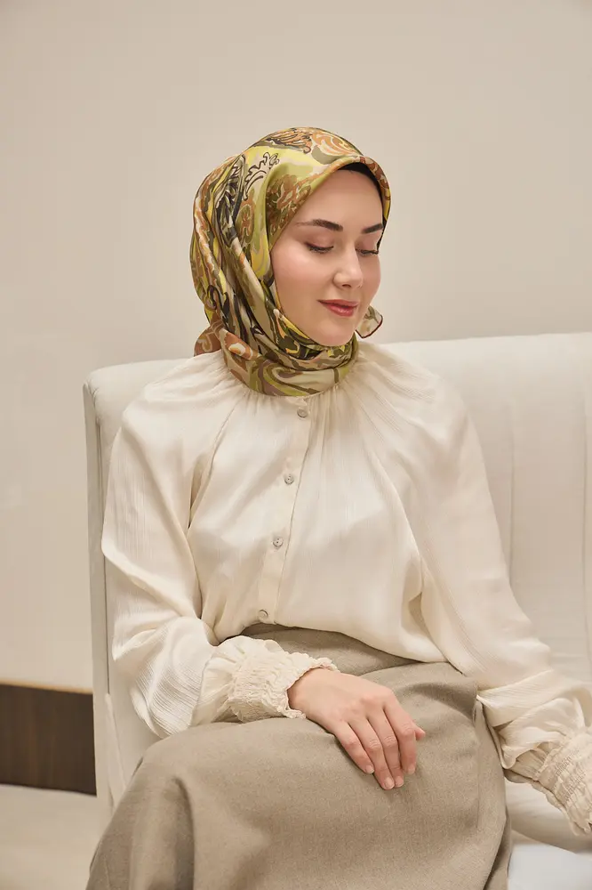 Yeşil sarı, haki, yeşil, kahve, sarı, mocha tonlarının doğal uyumunu yansıtan bu twill ipek eşarp, tok duruşlu yapısıyla gün boyu formunu korumak isteyen kullanıcılar için ideal bir seçimdir. Twill dokumasının sunduğu kaymaz kumaş özelliği, eşarbın başta kolay şekil almasını sağlar ve gün içinde kayma hissini en aza indirir.